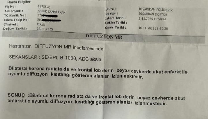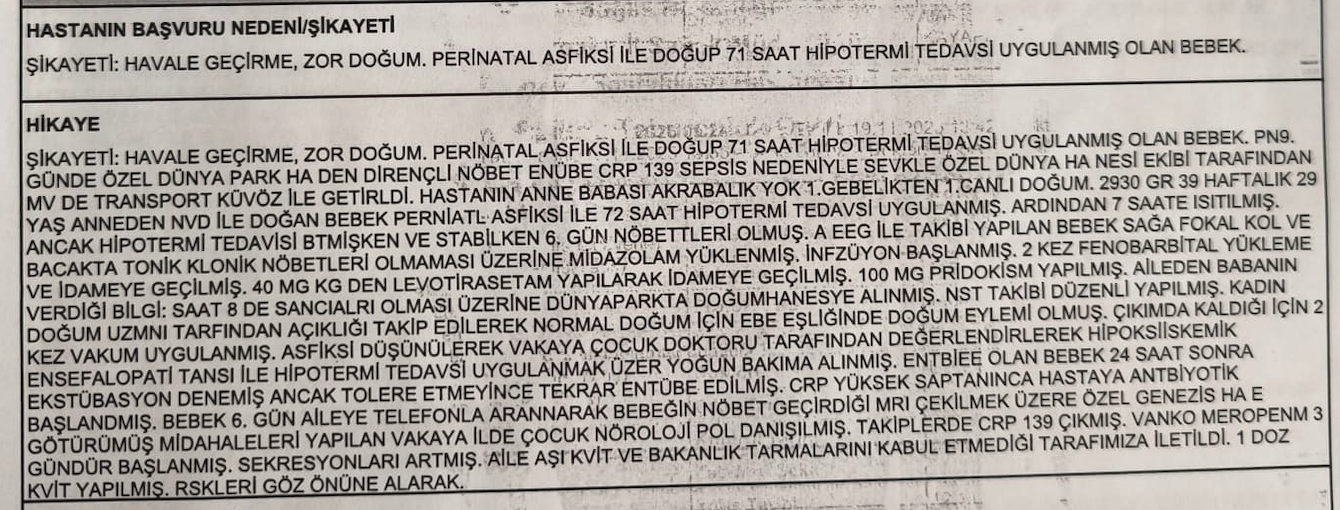 Epikriz kayıtlarında bebeğin 6. günde oksijensizliğe bağlı tekrarlayan nöbetler geçirdiği belirtiliyor. Yapılan MR incelemesinde ise beynin frontal lobu ve korona radiata bölgelerinde akut enfarkt (doku ölümü) ile uyumlu alanlar tespit edildi. Raporda “difüzyon kısıtlılığı mevcut” ifadesi yer alırken, bu bulgunun beyin hasarı anlamına geldiği kaydedildi.