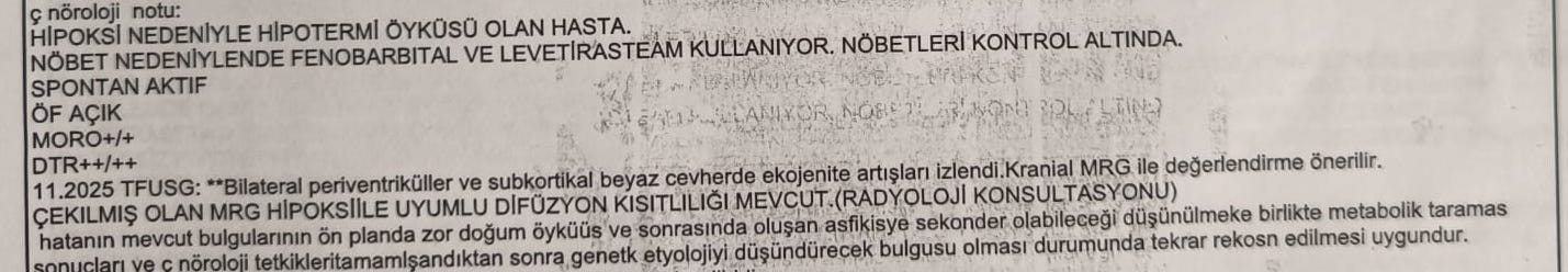 Takip notlarında ayrıca bebeğin birkaç gün boyunca hipotermi tedavisi aldığı, nöbetler nedeniyle fenobarbital ve levetirasetam gibi antiepileptik ilaçlarla tedavi edildiği, EEG’de fokal ve zayıf aktivite izlendiği bilgileri de bulunuyor. Birçok kayıtta “hipoksik etkileşim mevcut” notu yer alıyor.